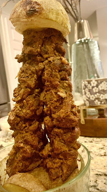 - For threading the meat first take a half onion and put 3 to 4 skewers in it. Now start threading meat pieces. Fill the meat closely so there is not much gap between the meat.