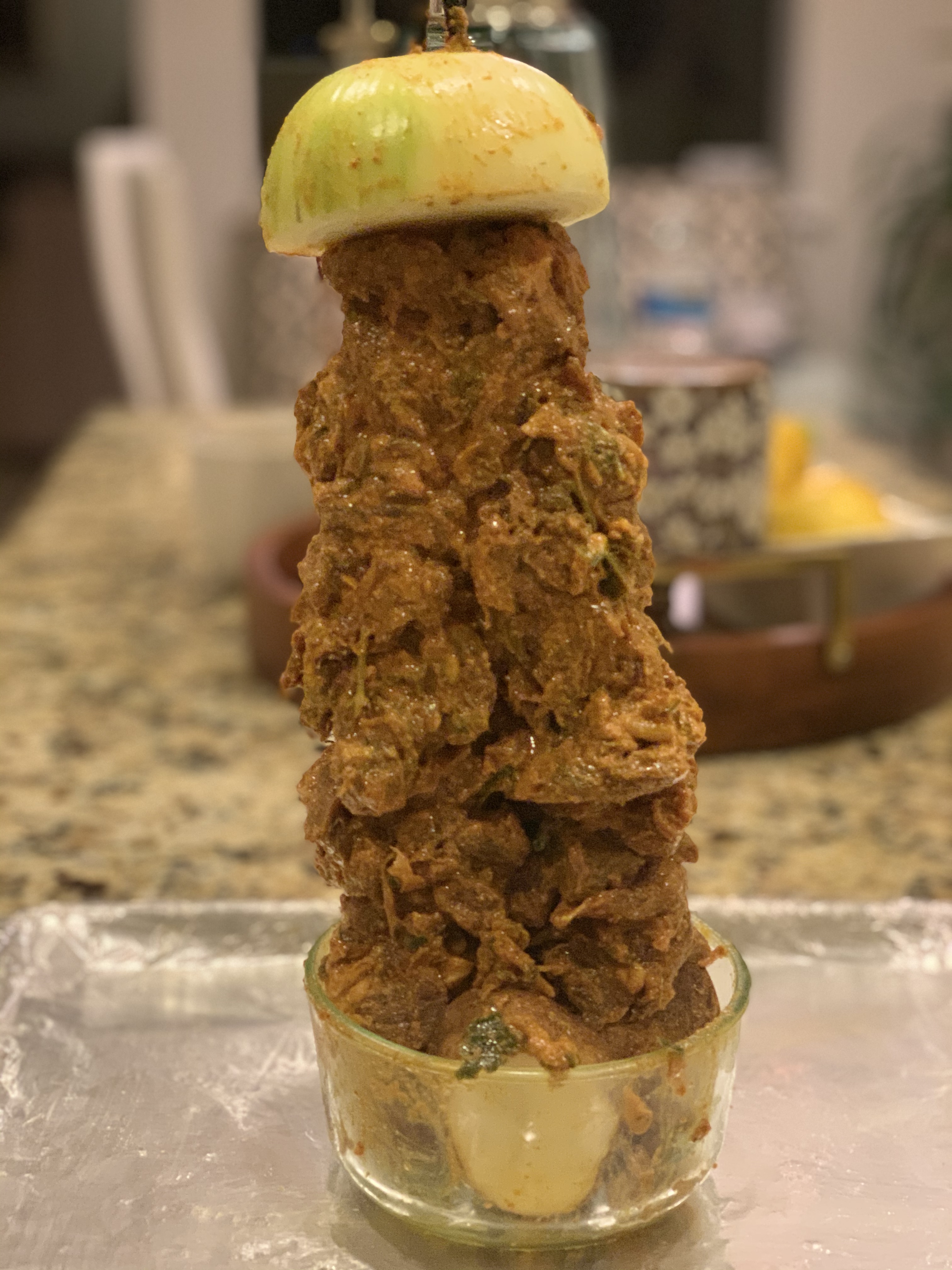 - Now cover the skewers with another half onion.